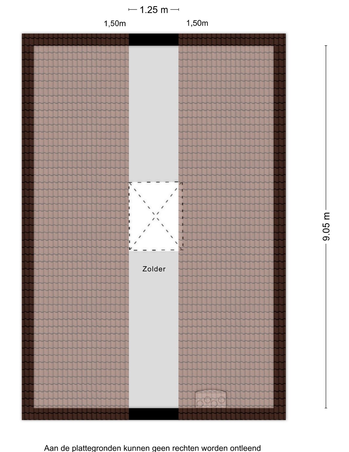 Bergzolder, afmetingen ca. 9.05 x 1.50 m.
