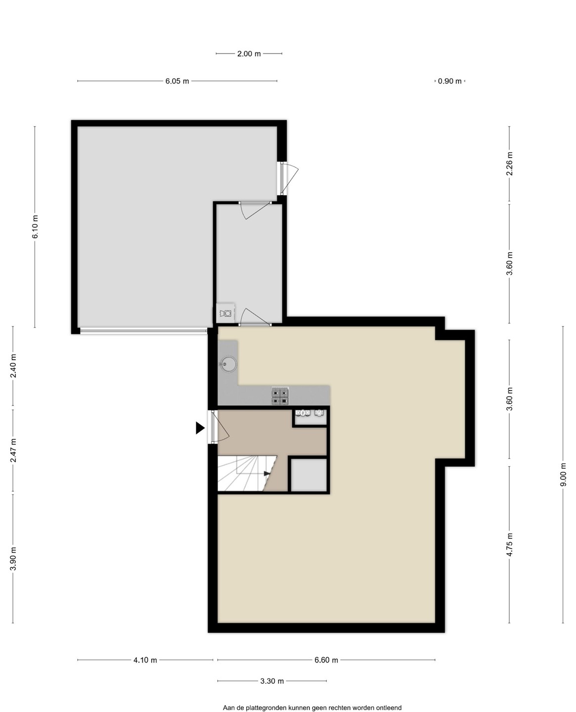 Woonkamer, afmeting ca. 3.90 x 6.60 m. Keuken, afmeting ca. 2.40 x 3.30 m. Eetgedeelte, afmeting ca. 5.10 x 3.30 m. (voorzien van erker met schuifpui) Hal, afmeting ca. 2.47 x 3.20 m.(inclusief toilet en trapopgang) Bijkeuken, afmeting 3.60 x 2.00 m. (voorzien van aansluiting was-/droogmachine) Garage, afmeting 6.10 x 4.10 m. / 2.05 x 2.25 m.