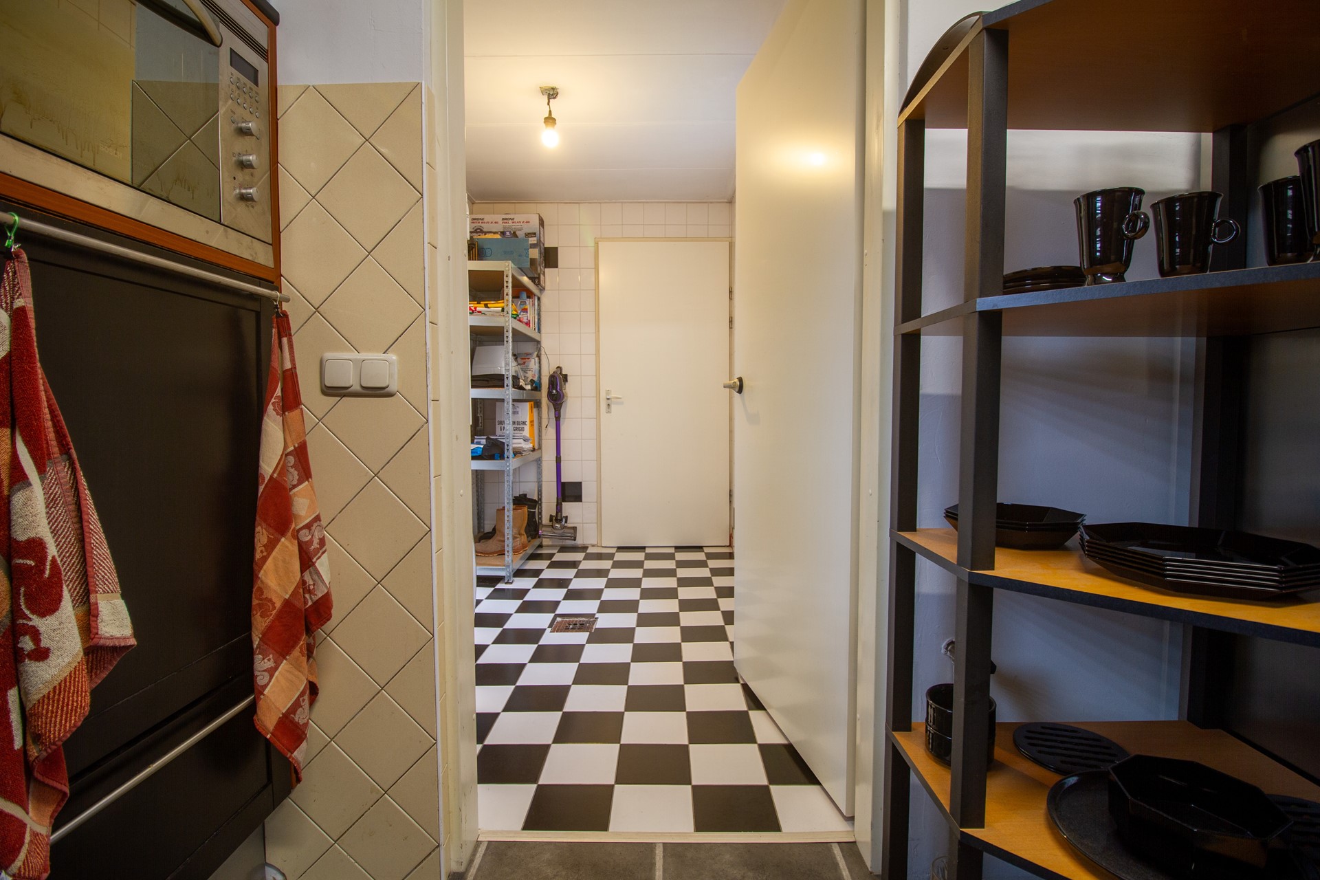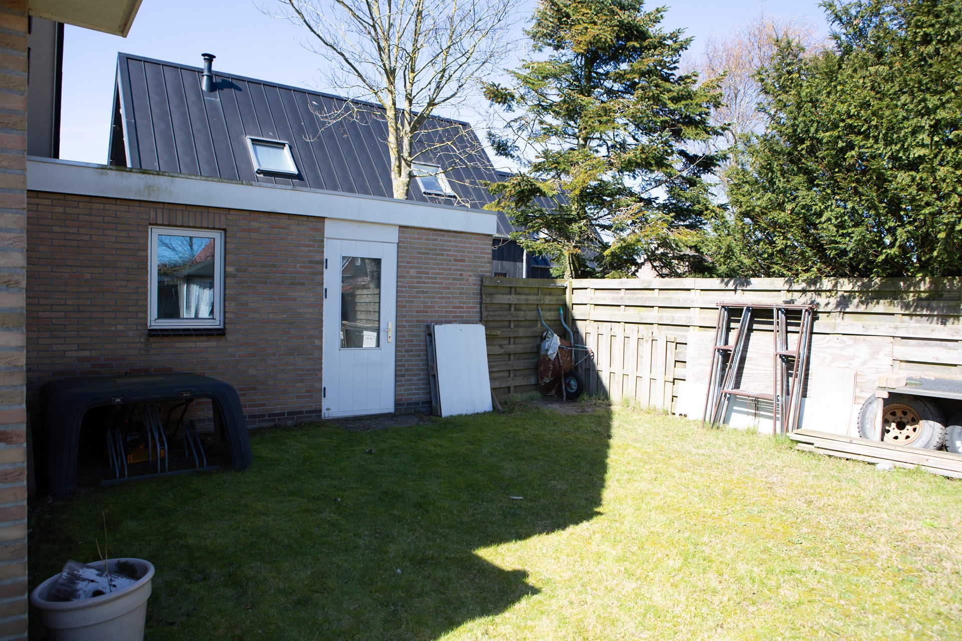 De entree geeft toegang tot de centrale hal met toiletruimte en de vaste trap naar de eerste verdieping. Vanuit de hal kom je in de woonkamer met een halfopen keuken, voorzien van alle basisgemakken. De woonkamer heeft een erker met schuifpui die direct leidt naar het terras en de tuin, op het noordoosten gelegen. Via de keuken is er toegang tot de bijkeuken met aansluitend de garage, vanwaar je ook de tuin kunt bereiken.