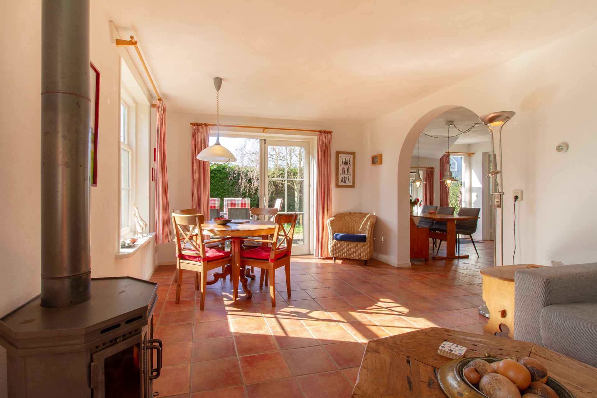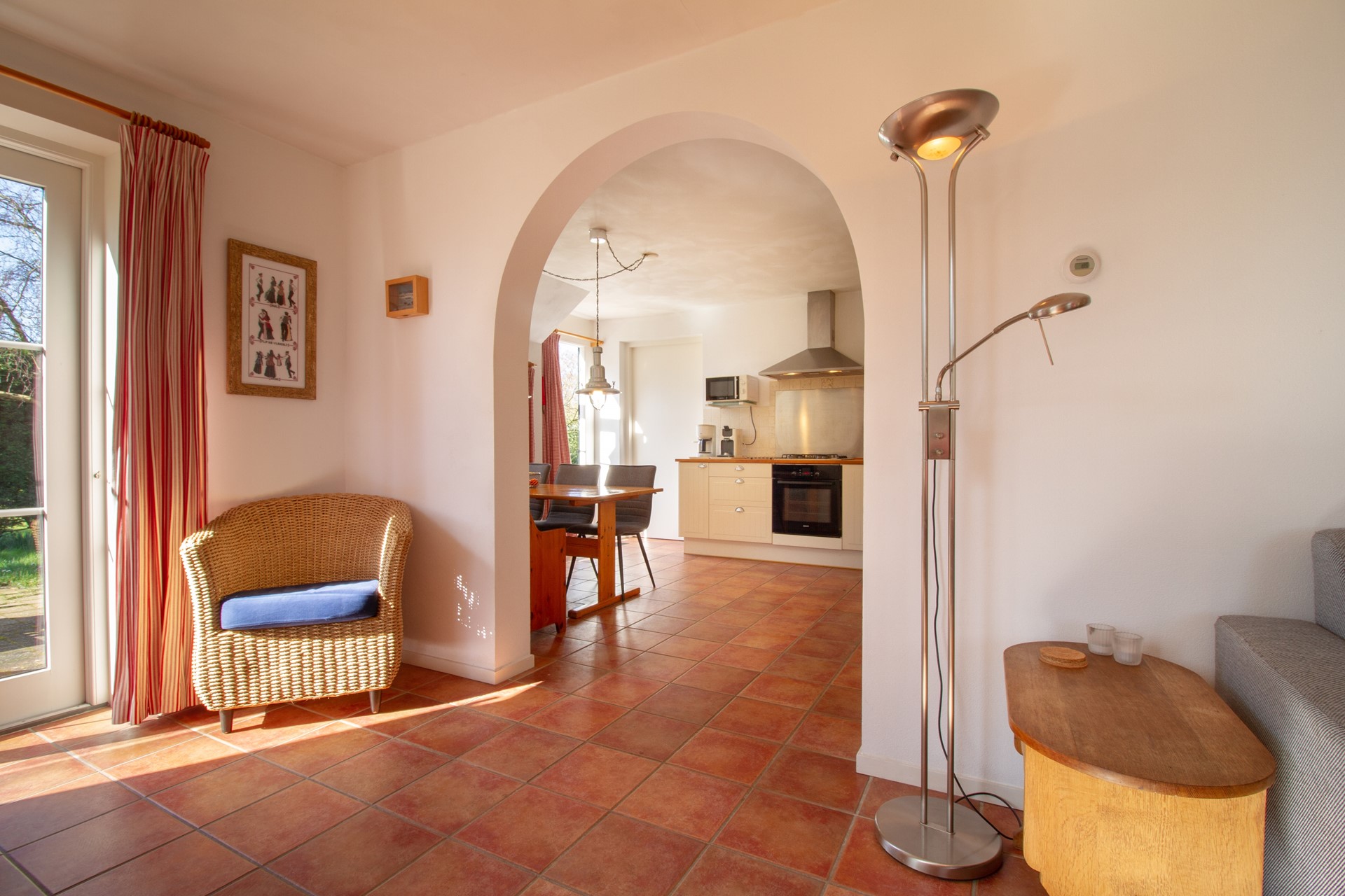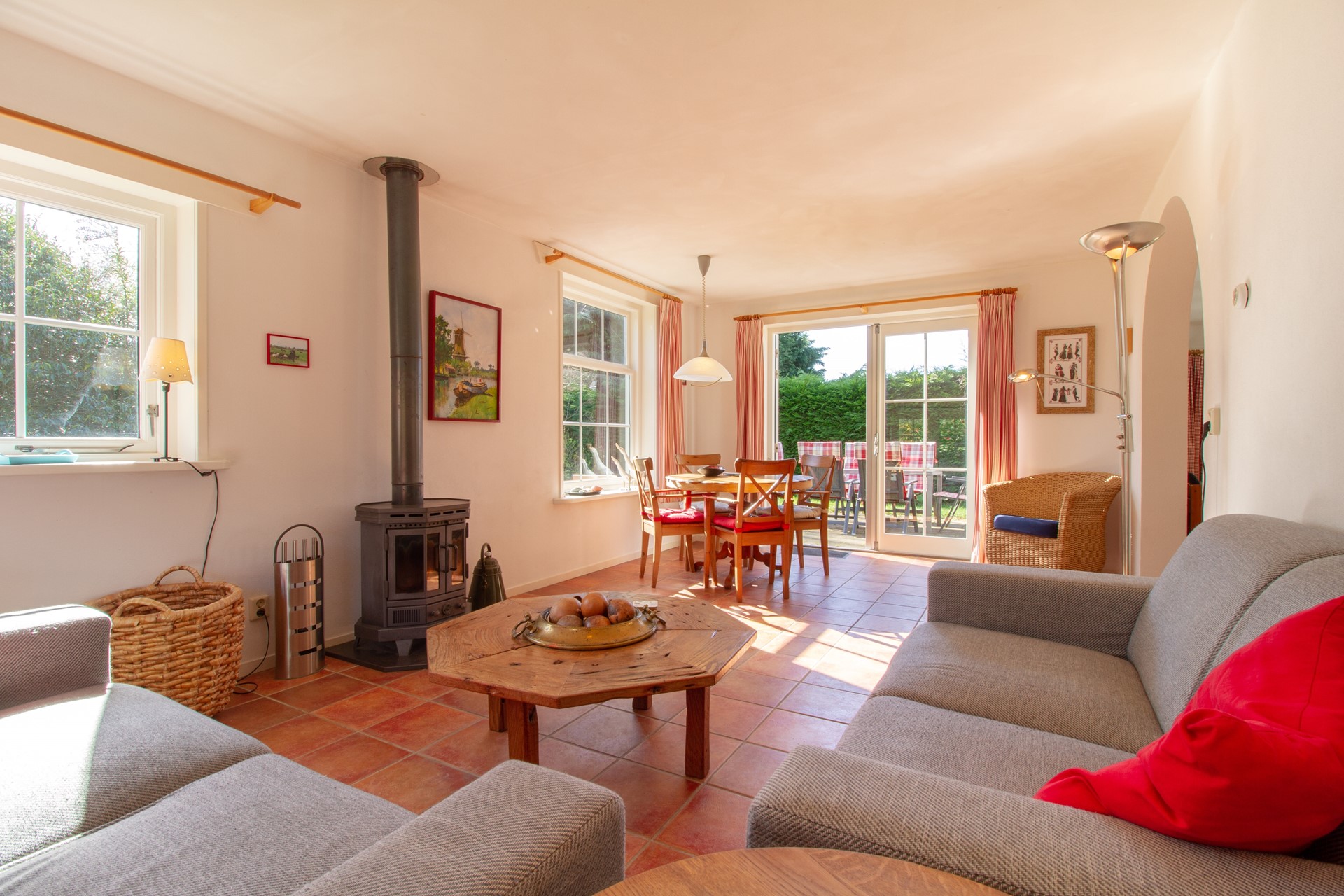 De tuin is te bereiken vanuit zowel de woonkamer, de keuken als de bijkeuken.