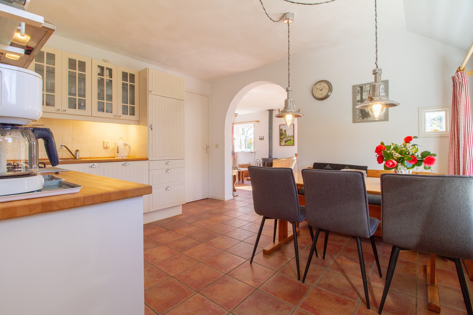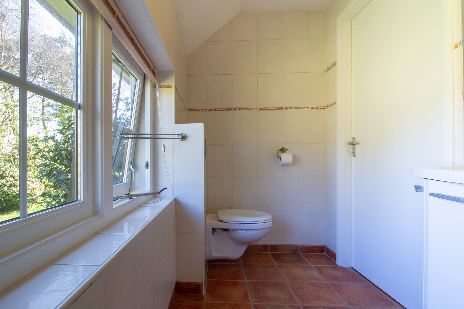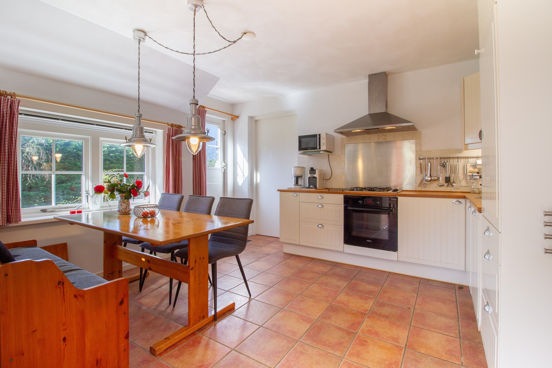 De tuin is te bereiken vanuit zowel de woonkamer, de keuken als de bijkeuken.
