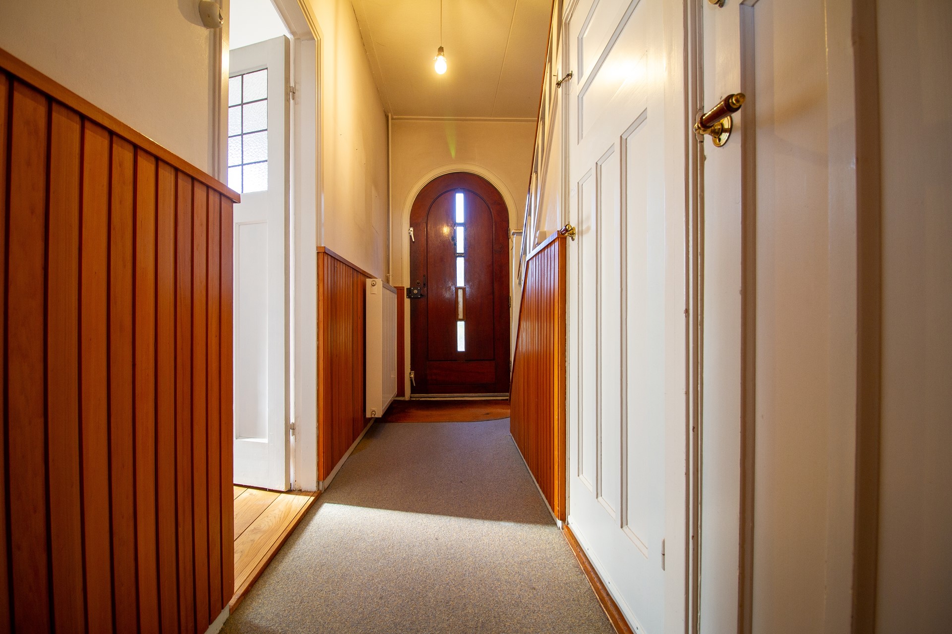 Entree, centrale hal welke toegang geeft tot toilet, woonkamer, achterkamer en keuken. In de centrale hal bevindt zich ook de vaste trapopgang naar de eerste verdieping. Trap voorzien van trapkast met kelderruimte (stahoogte 1.75 m.)