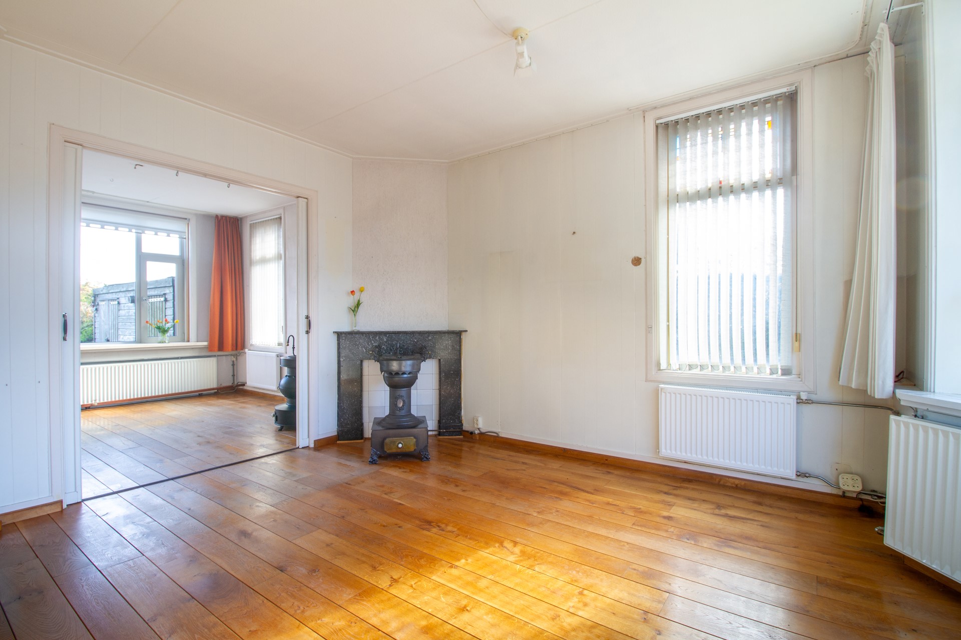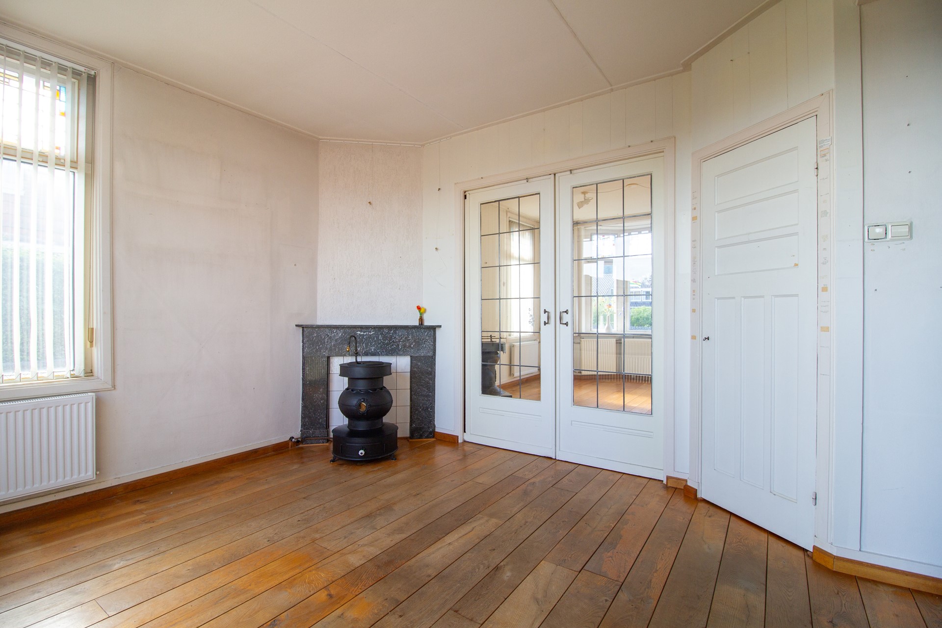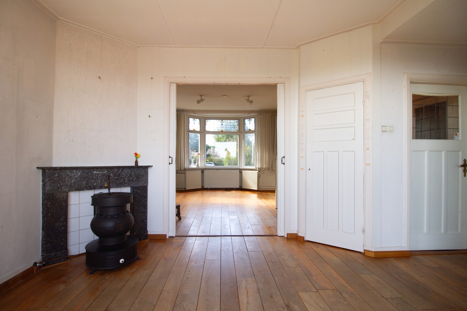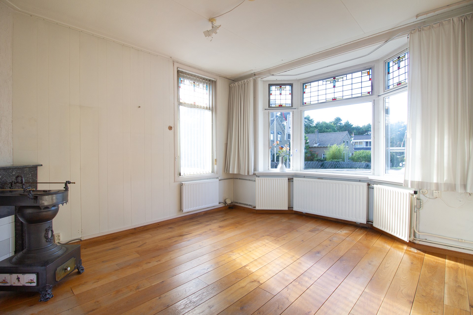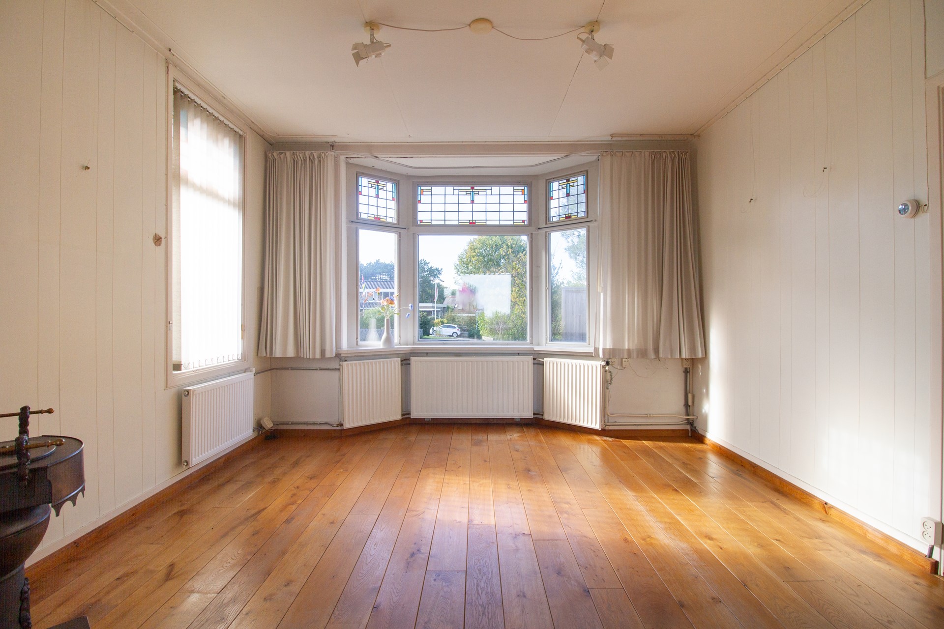De woonkamer met erker is voorzien van en-suitedeuren mét glas-in-lood ramen.